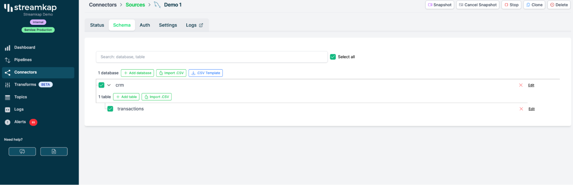 Streamkap provides a dashboard where you can: